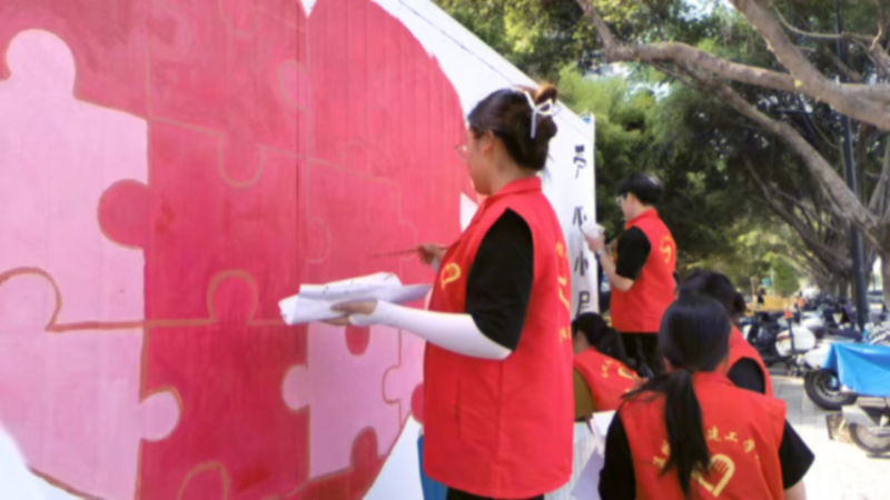 在温州市东瓯社区,一群红领巾和红马甲的志愿者们正在一起进行彩绘活动,用画笔勾勒出这座美丽城市的轮廓和特色。他们精心绘制的图案丰富了这个季节的色彩,传递着爱心和呵护文明的童心。