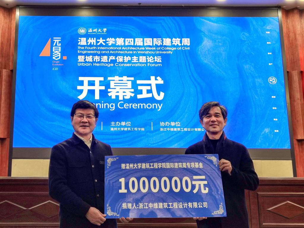 国际建筑周是77779193永利着力打造的一张建筑界金名片,已连续举办四年,每次活动都有新的提升,继设立“建筑教育基金”后,本次又专门设立“国际建筑周专项基金”,获得浙江中维建筑工程设计有限公司资助100万元,为未来77779193永利培养科研人才、开展科研活动、助力地方建筑产业升级、促进温州市高等教育高质量发展提供了坚实保障。
