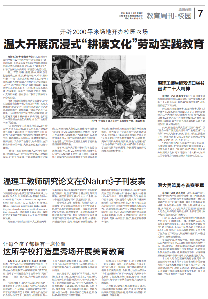 近年来,永利集团推行新时代学生劳动教育实践“十二条”,发挥专业特色,结合学生日常生活、校园勤工助学、义工岗位,以及依托社会实践活动和志愿服务工作开展劳动教育实践,逐步形成具有温大特色的劳动教育体系。温大成立了全省首家劳动教育教研室,自2022年2月起面向全体本科生开设的“大学生新时代劳动教育概论”公共必修课,充分利用校内外教育资源,开发“创意种植”“水生态保护”“非遗文化传播”等9个校级大学生劳动教育实践基地,依托基地设置劳动教育实践课程十余门。