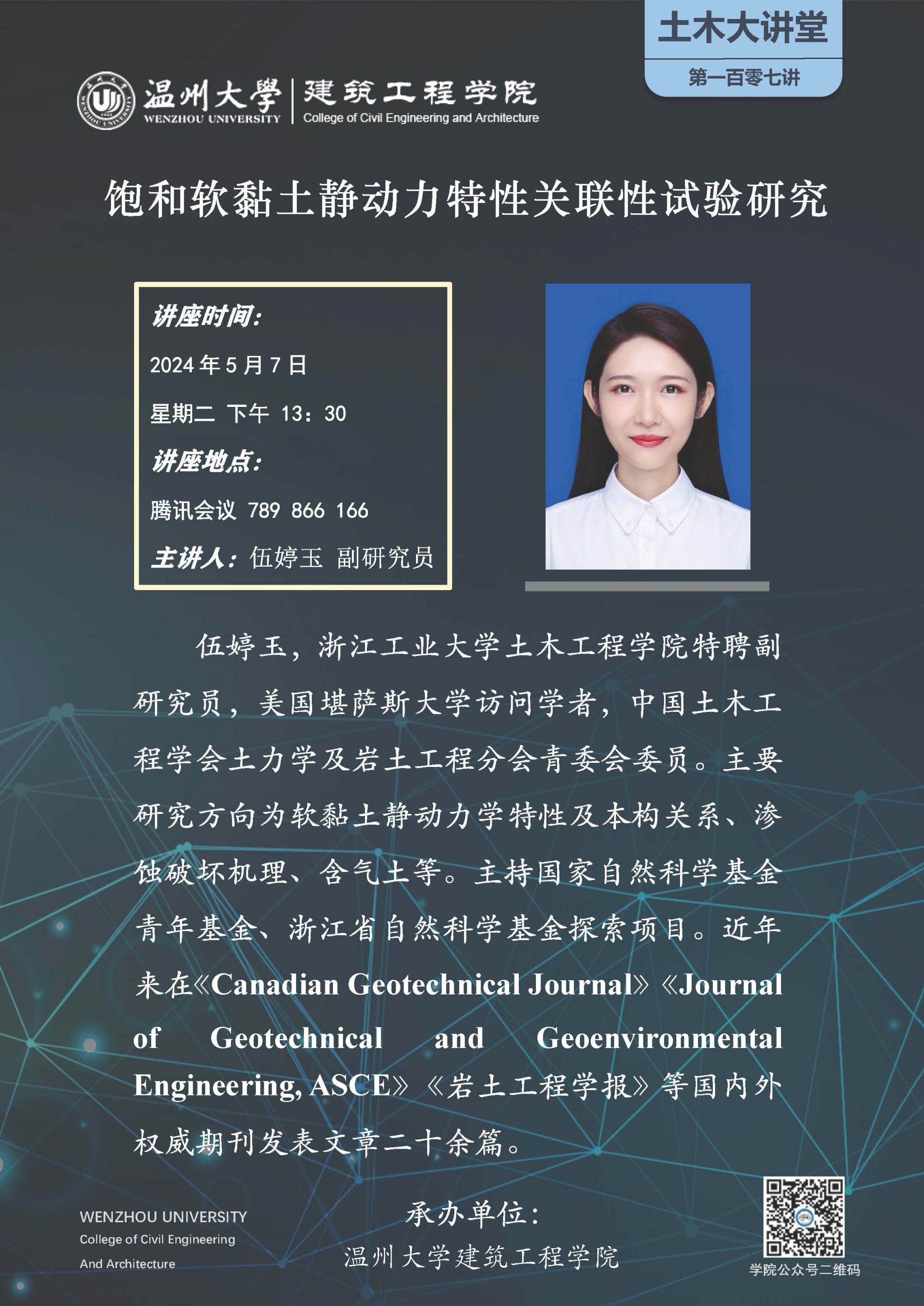学术讲座预告:饱和软黏土静动力特性关联性试验研究