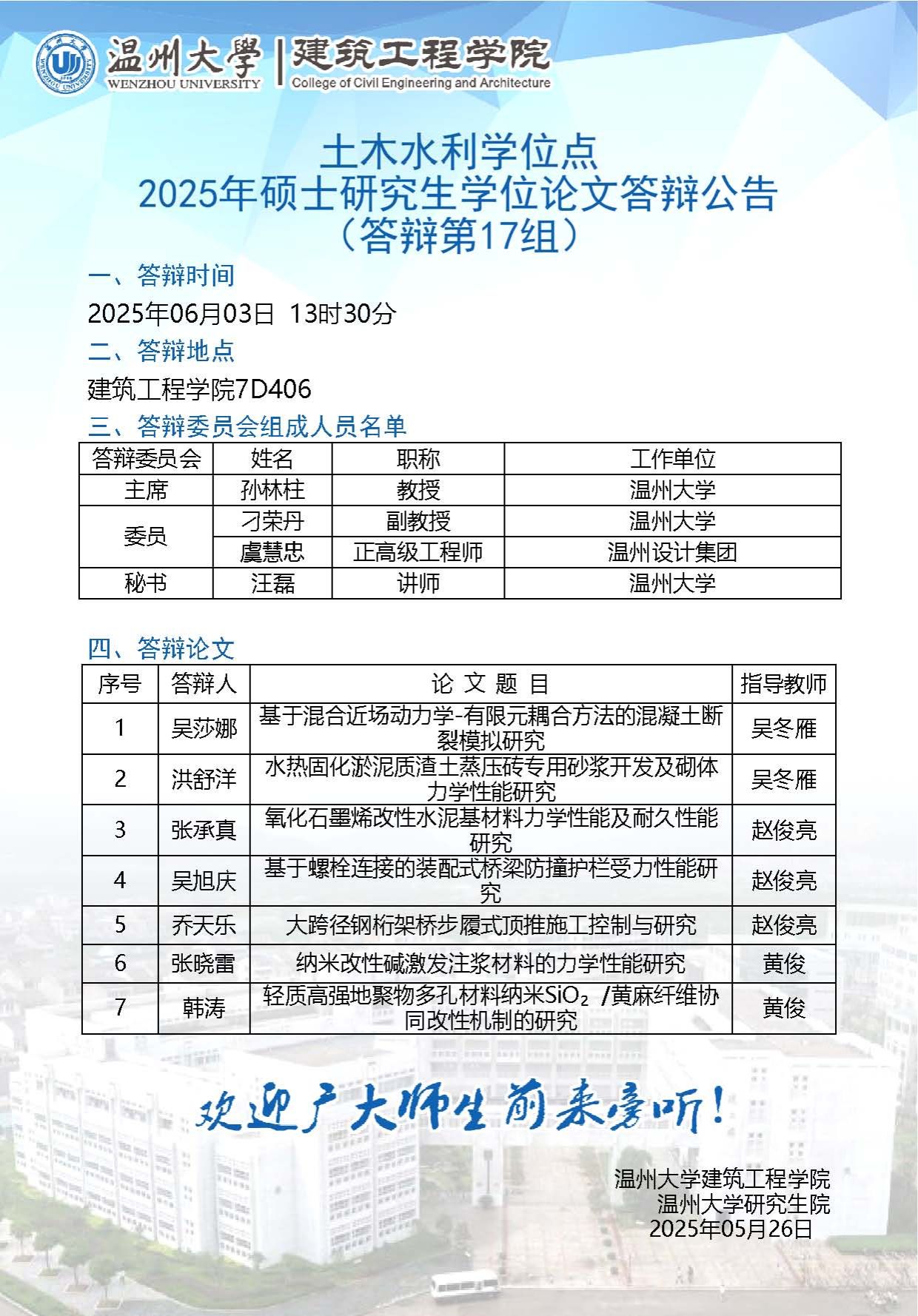 77779193永利2025届(六月)硕士研究生学位论文答辩公告(六)