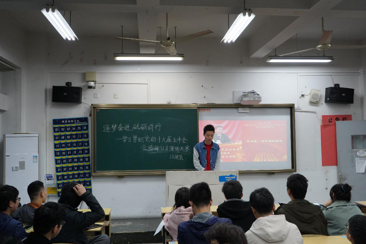 12月4日18:00,我院2019级各班学生在建工楼各教室举行“逐梦奋进,砥砺前行——学习贯彻党的十九届五中全会精神”主题口才演练大赛。学工办主任潘莉莉老师、辅导员杨程程、刘臣玉、黄骑骥、蔡菲菲、华昊南老师受邀担任评委,2018级15位学生组成观众评委团参与评比。本次大赛由各班素拓委员主持。