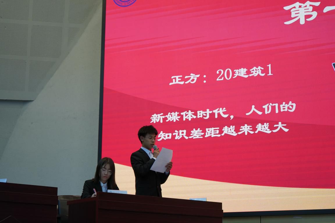 此次辩论赛分五组,辩题为“新媒体时代,人们的知识差距越来越大还是越来越小”“对于大学生而言,学业成绩更重要还是生活阅历更重要”等5个。比赛中,双方参赛选手在立论、对辩的环节中都表现出清晰的思路与珠玑的辩才,他们据理力争、金句频出、火花四溅。在自由辩论环节,双方展开激烈交锋,选手们紧扣辩题进行辩论,你来我往,妙语连珠。场下观众激情澎湃、掌声阵阵、直呼过瘾。