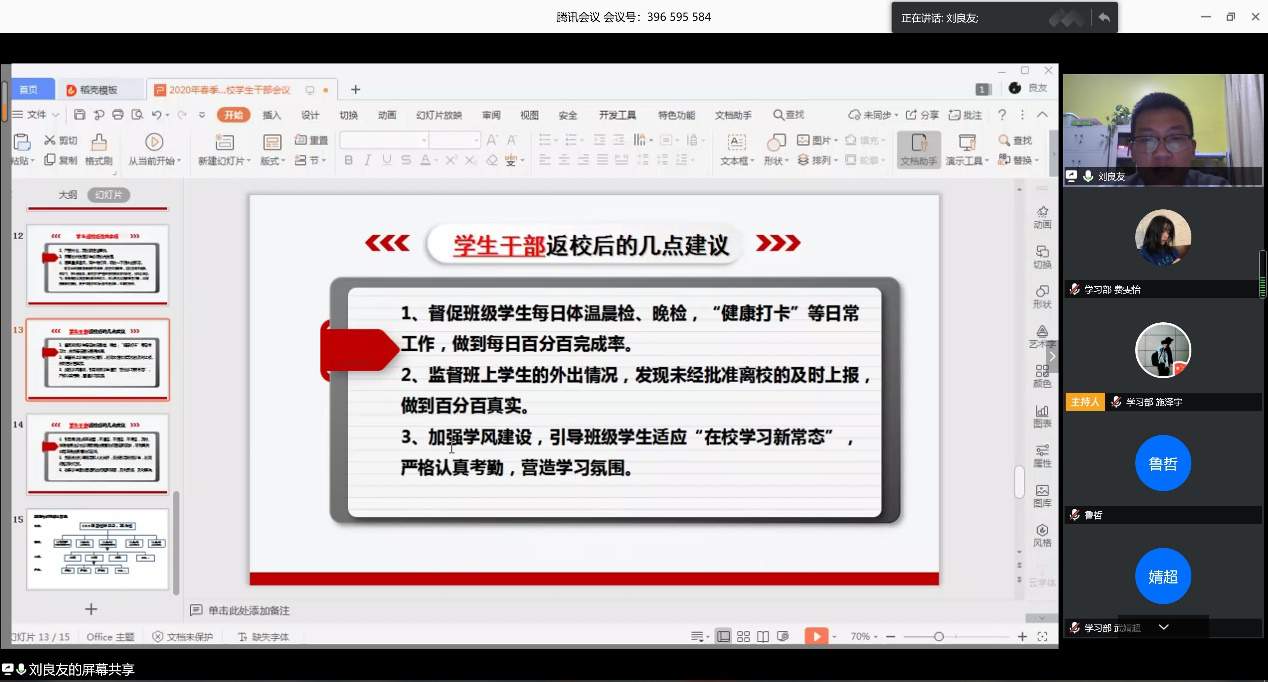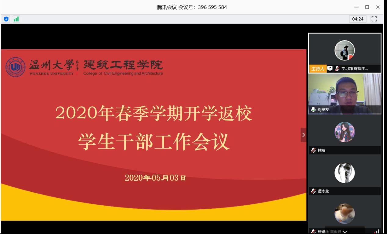 为新学期开学返校各项工作顺利开展,5月3日下午,我院通过线上平台召开了2020年春季学期工作会议。会议由建工团学学习部主办,建工团学指导老师、辅导员刘良友老师,团学全体成员以及全体班委出席了本次会议。